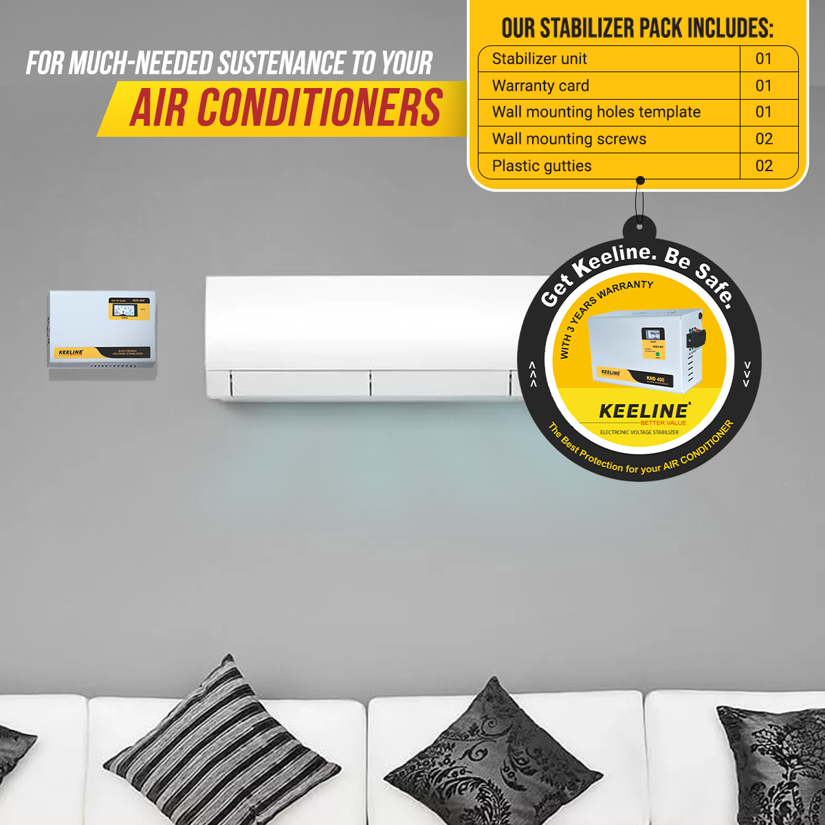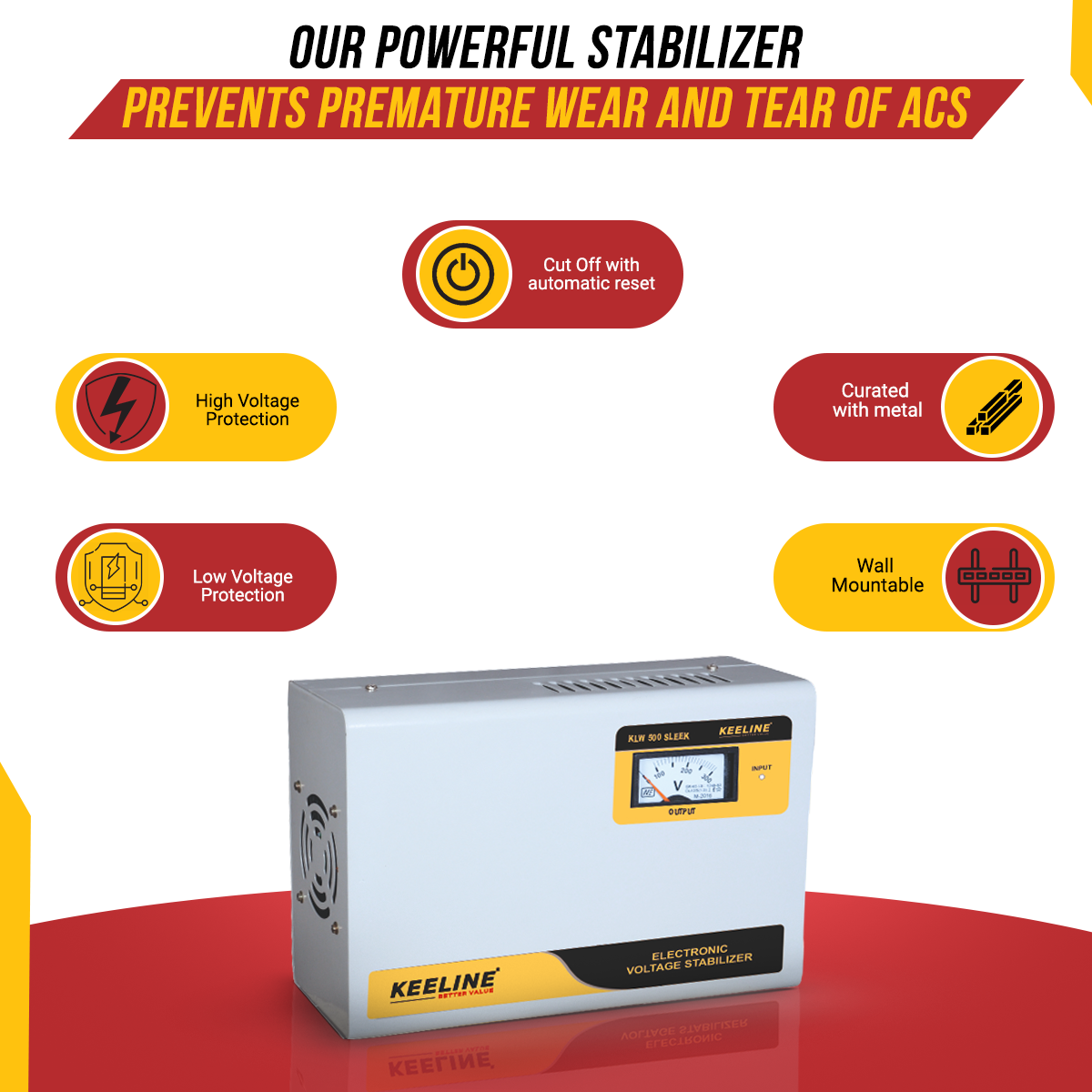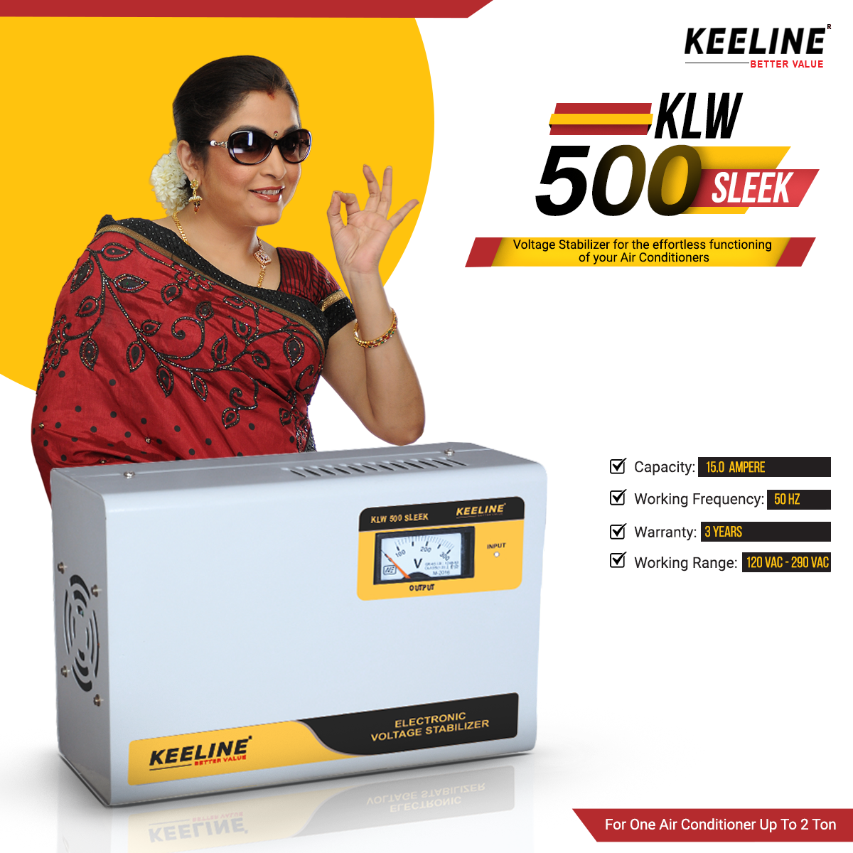 KLW-500 Sleek - Stabilizer for Air Conditioner from KEELINE® a trusted brand for Automatic Voltage Stabilizers, designed to work under wide range of Input Voltage, offers protection from low/high voltage fluctuations by assuring optimum Voltage to your Air Conditioner and ensures efficient functioning. Manufactured with quality components for durability of the Stabilizer and offers reliable protection to your appliance.