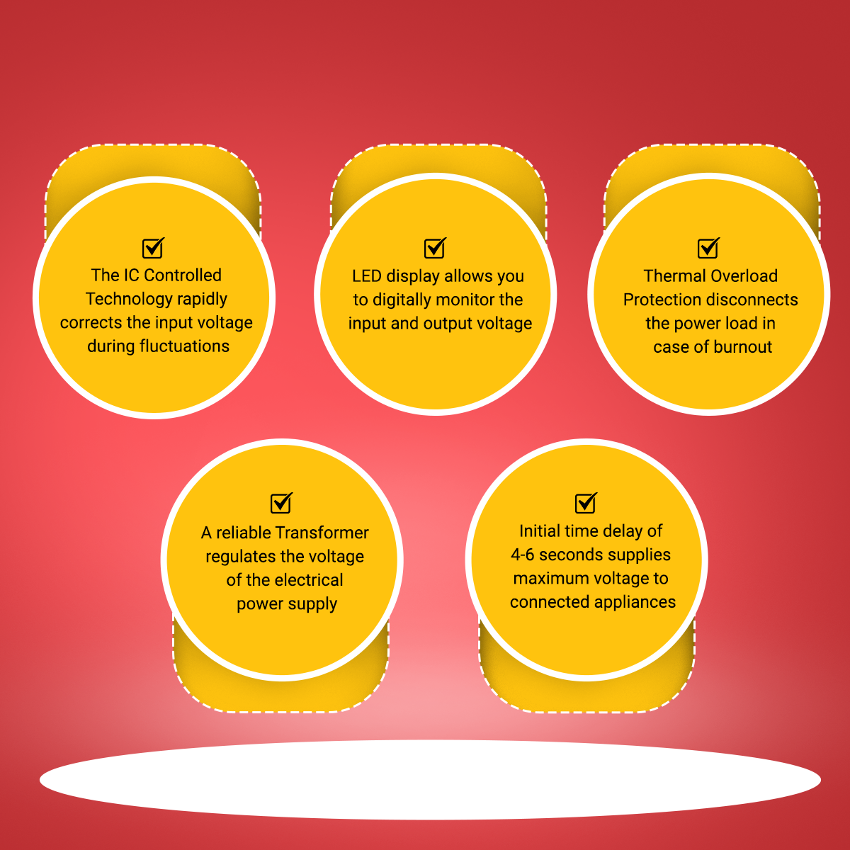- Automatic High & Low Voltage Cut Off with automatic reset - Protects connected appliance during low and high voltage fluctuations. Efficient Heavy Duty Transformer - regulates Input Voltage fluctuations to deliver a consistent range of Output Voltage, Thermal Overload Protection with Auto Cut-off - turns off the stabilizer output completely in case of a short circuit or any kind of burn-out in case of overload.
