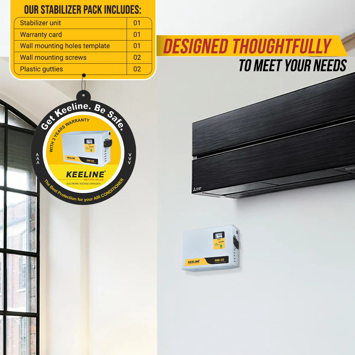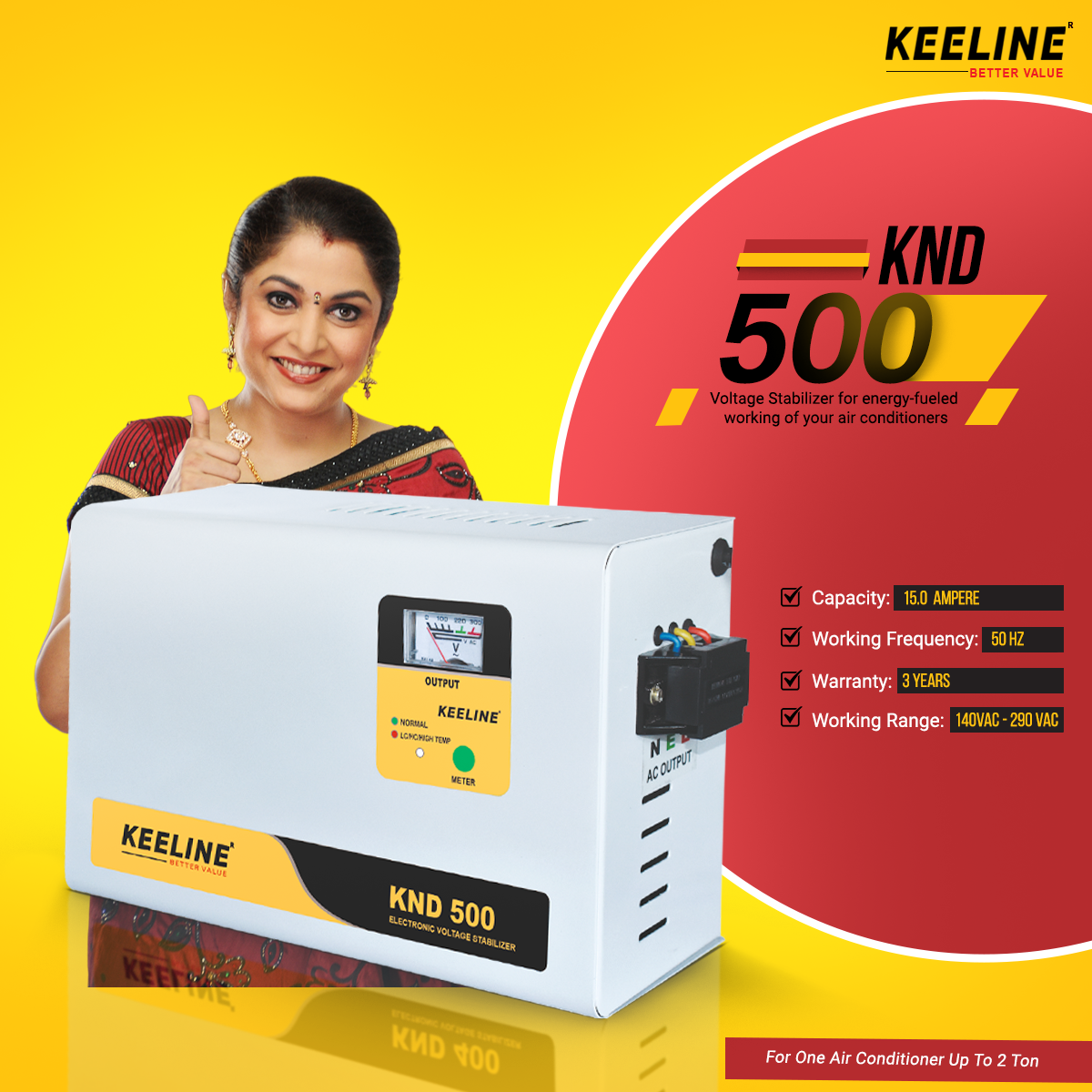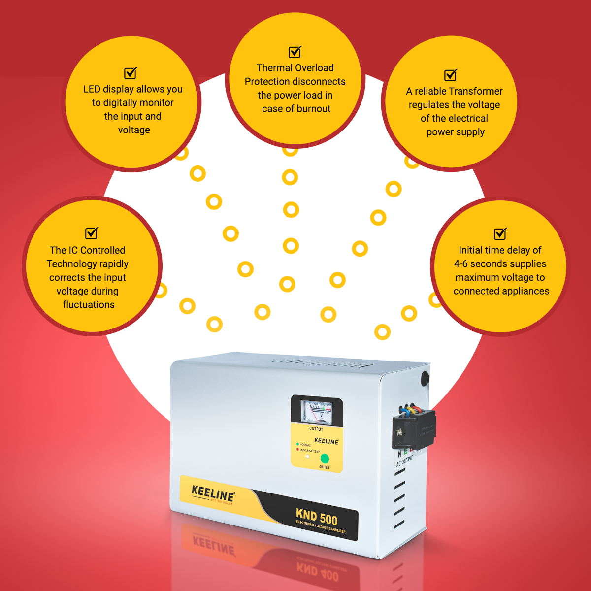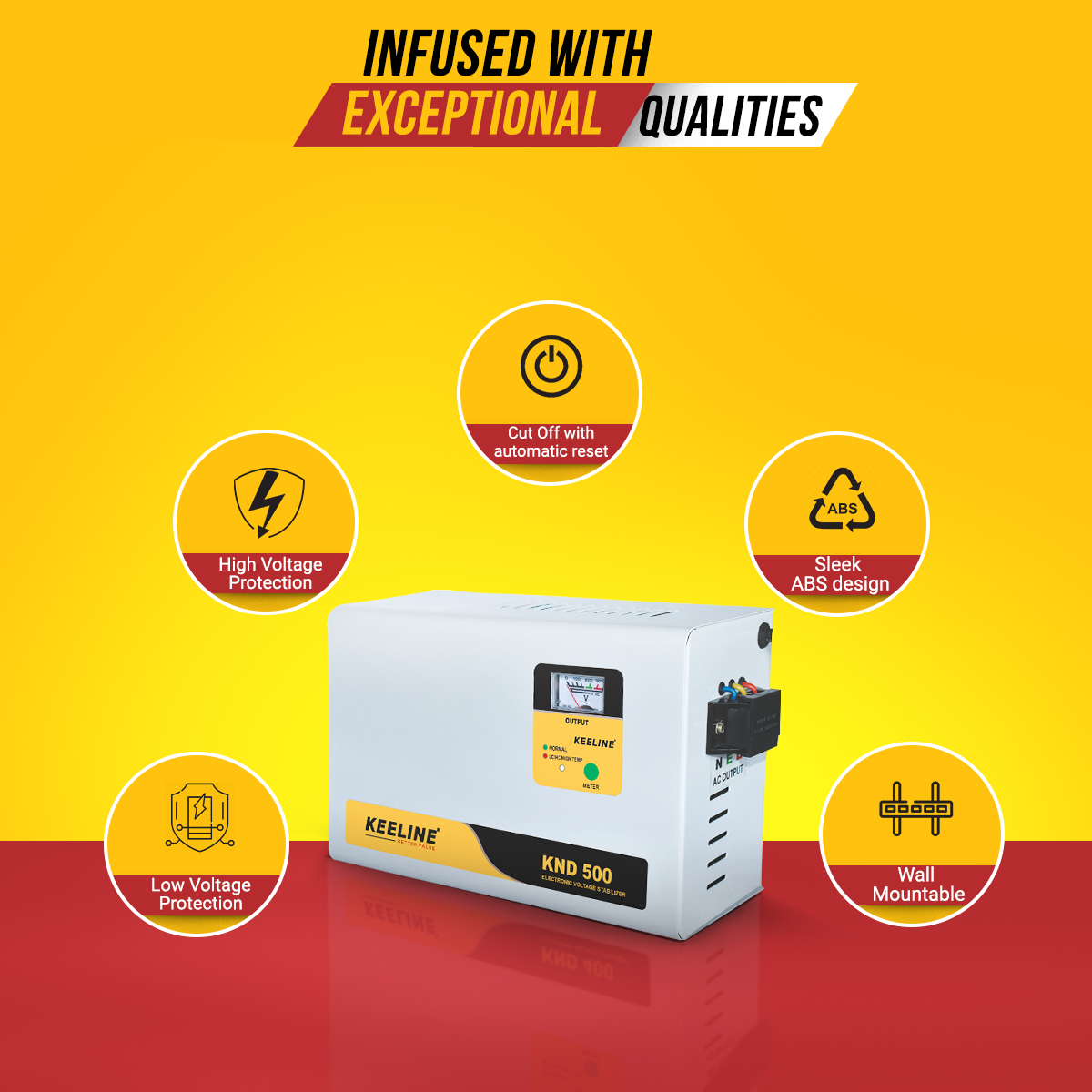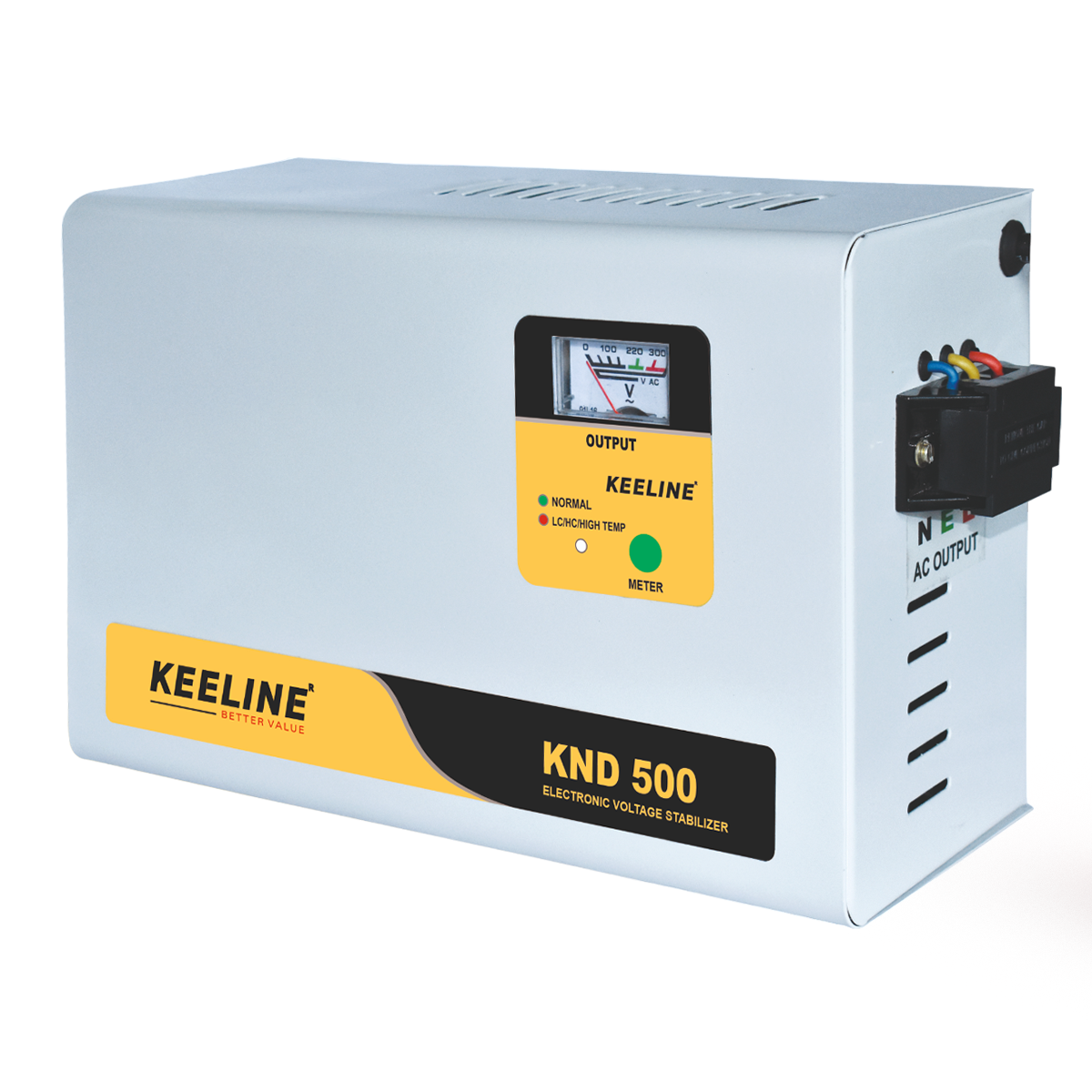 KND-500 - Stabilizer for Air Conditioner from KEELINE® a trusted brand for Automatic Voltage Stabilizers, designed to work under wide range of Input Voltage, offers protection from low/high voltage fluctuations by assuring optimum Voltage to your Air Conditioner and ensures efficient functioning. Manufactured with quality components for the durability of the Stabilizer and offers reliable protection to your appliance.
